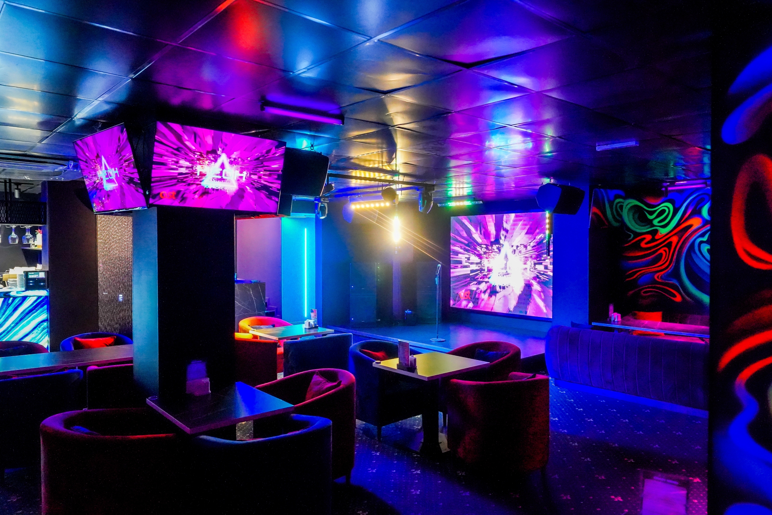 Уютный интерьер, неоновое освещение и качественная акустика создают атмосферу, в которой хочется петь и наслаждаться музыкой.
